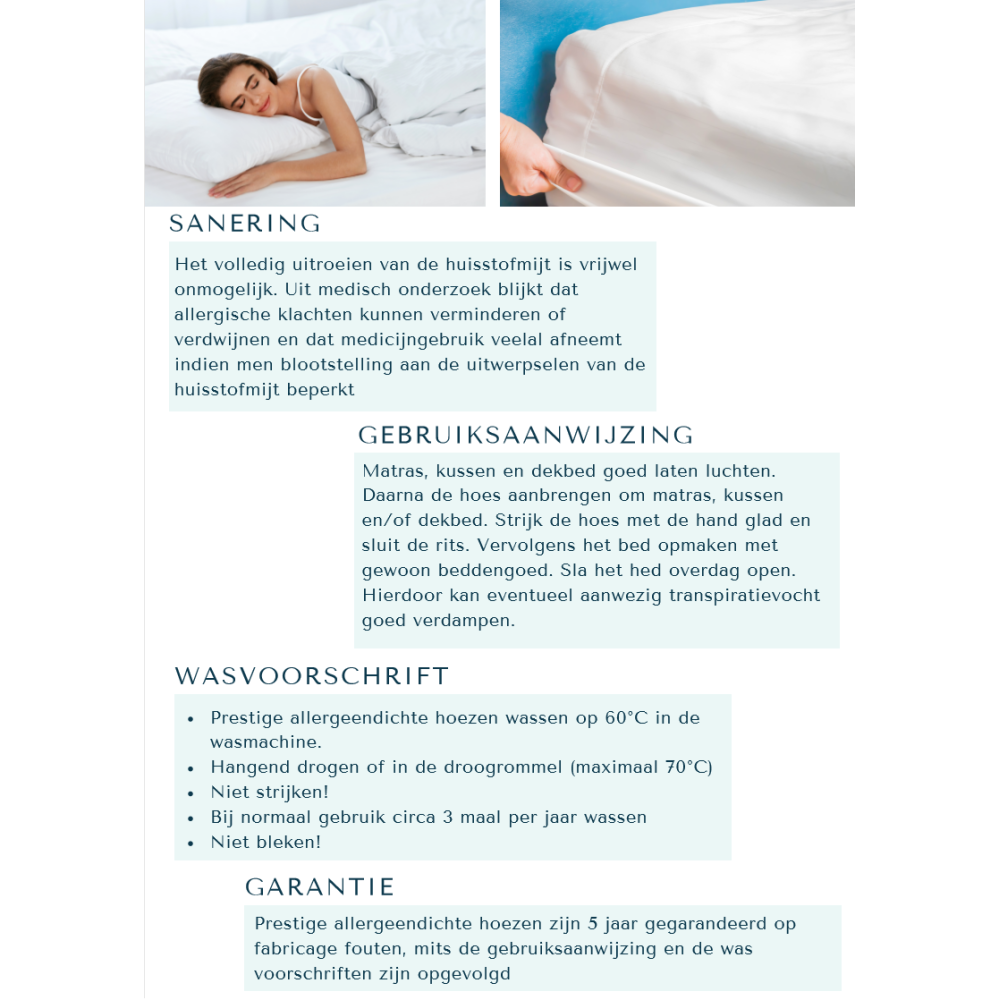 Prestige allergeendichte hoezen zijn 5 jaar gegarandeerd op fabricage fouten, mits de gebruiksaanwijzing en de was voorschriften zijn opgevolgd